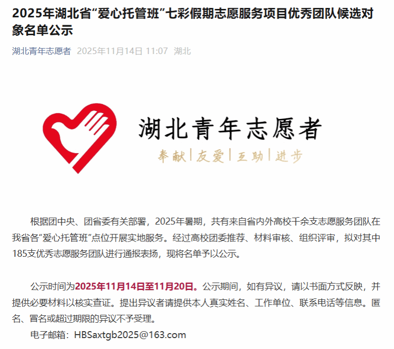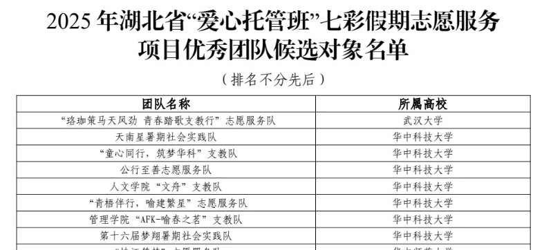 (通讯员 陈金林)近日,湖北省青年志愿者协会公布2025年湖北省“爱心托管班”七彩假期志愿服务项目优秀团队名单,我院“砼心筑梦”志愿服务队凭借扎实的服务成效与突出的综合表现,成功获评“优秀团队”荣誉称号。