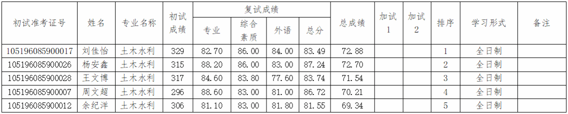 根据教育部、湖北省教育厅的有关文件,依据《伟德(国际)唯一官方2026年硕士研究生招生复试录取工作方案》,我校于2026年3月26日组织了土木水利专业一志愿上线考生复试,现将5名考生复试成绩公示如下: