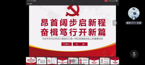 本次主题党日活动围绕七项内容展开。第一项,全体起立,奏唱国歌《义勇军进行曲》;第二项,全体学生党员重温入党誓词;第三项,由文耀同志带领大家学习并诵读《中国共产党章程》,增强对党的认识,加深政治信仰;第四项,由王吉同志分享学习《关于新形势下党内政治生活的若干准则》的学习心得:“共产党员必须成为实现四个现代化的先锋战士,努力做到又红有专。每个共产党员都必须以无产阶级先锋战士的标准严格要求自己,努力学习和领会马列主义、毛泽东思想,不断提高觉悟程度和进行现代化建设的本领,以求对四化建设做出更大的贡献。”;第五项,乐甜同志为大家讲党课,学习习近平总书记在深入推进长三角一体化发展座谈会上的重要精神;第六项,各支部交流发言,龙林鑫、王雯倩、周传龙依次发言;第七项。各支部小组相互讨论,党员们交流讨论自己的学习心得,表示自己在今后要把习近平新时代中国特色社会主义思想贯彻落实到学习工作中。