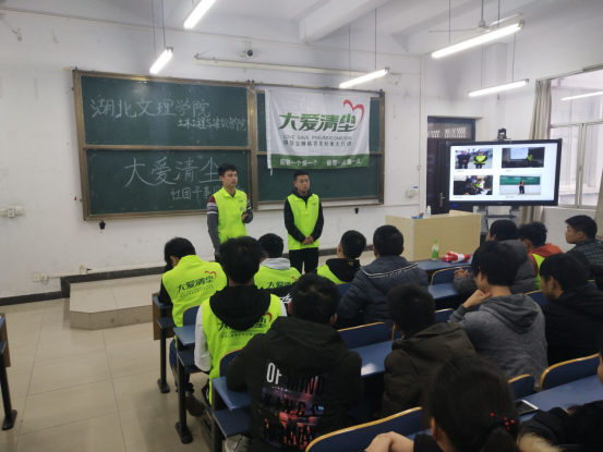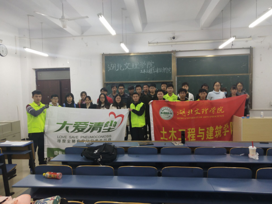 10月,在吴旻昊老师的指导下,部分学生志愿者前往谷城县石花镇探访尘肺患者,并为患者配送大爱清尘的制氧机。11月,吴旻昊老师连续召开了四场《中国尘肺农民生存现状》的讲座,呼吁学生们参与公益,乐于奉献。经过这些前期活动的铺垫,同学们踊跃参与,并向学校申请成立尘肺方面公益社团。经校团委批准,大爱清尘志愿者协会正式成立,目前该协会共有122名学生志愿者,正在召开为尘肺捐步的公益活动,计划与学校的万人徒步和运动校园相结合,让学生们锻炼身体的同时也能做公益。