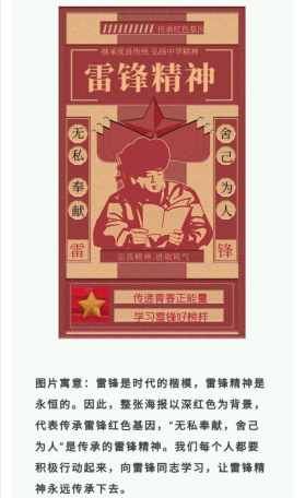 此次活动从2021年3月18日持续到2021年3月27日,活动作品参选形式多种多样,有海报和H5视频两种形式,内容丰富多彩,寓意深长,一张海报不仅是同学认真思考的结晶,更是雷锋精神的另一钟表达...