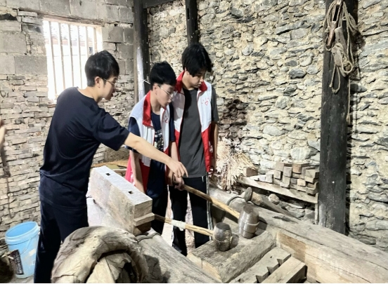 首先,同学们开展了民宿调研、设计文艺挂牌,并对古法榨油、酒坊进行了调研和拍摄宣传。在古法榨油坊,阮家明先生向同学们展示了传统榨油工具的使用方法,让同学们对古法榨油有了更深的理解和尊重,也为传统手艺的传承贡献了一份力量。