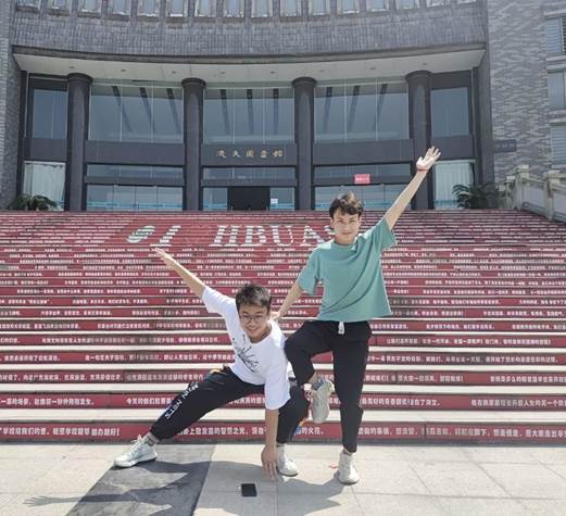 参赛选手在图书馆前进行拍照打卡比赛