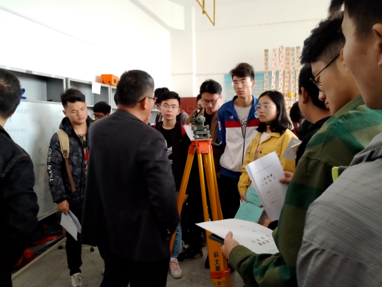 (周俭清给学生讲解水准仪的基本构造)