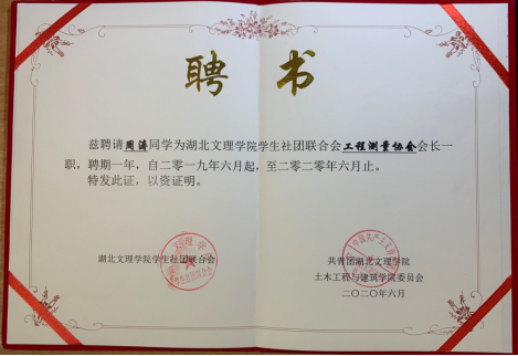 在学生工作方面,他作为工程测量协会的会长,积极筹备社团的有关活动。大二时,组织协调社团的各项工作,带领社团成功举办了第十届工程测量大赛。作为班级的学习委员,他认真细致地完成老师交办的每项任务,帮助同学解决学习和生活上的各种问题。