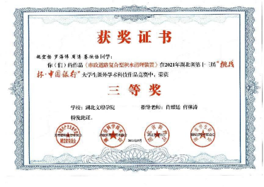施宏扬回忆起那段参加竞赛的经历感慨道:“起初,我了解到‘挑战杯’是一个含金量很高且极具挑战的竞赛,作为低年级的学生,经验上肯定会有欠缺,但我相信勤能补拙。”为了参加“挑战杯”,他提前一年为参赛项目做准备。从设计专利到队伍组建,从项目转化再到后来的答辩环节,不断钻研打磨,精益求精。这每一步的背后都少不了他和团队夜以继日的辛苦付出,也因此他们能在全校众多项目答辩中以一等奖的好成绩脱颖而出,最终更是获得了省级三等奖。
