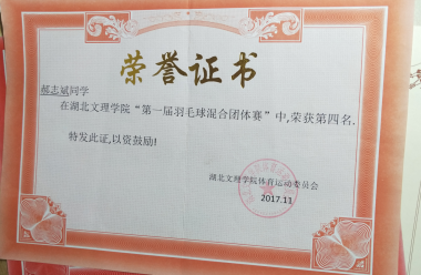 他是一个热爱运动的人,尤其喜爱羽毛球和乒乓球。从入学以来,他每周必须抽出两个晚上去球馆打球,在球馆他结识了不少志趣相投的好友。他不仅自己爱打,还带动着宿舍室友一起打。曾在学校第一届羽毛球大赛中获得第四名的好成绩。