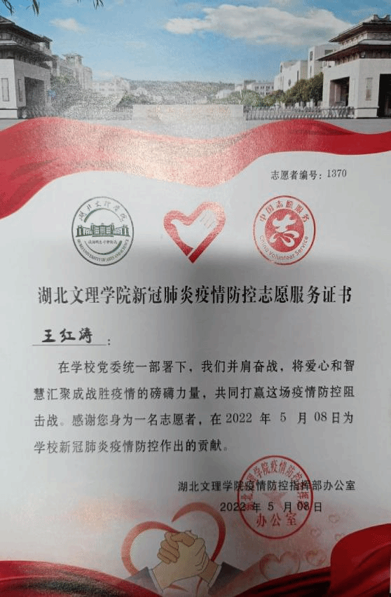 在校期间,他踊跃报名,积极参加志愿服务活动。在疫情防控期间,积极参与学校疫情防控工作,主动做为一名志愿者,为学校的疫情防控工作做出自己应有的贡献。在此项工作也获得了新冠肺炎疫情防控志愿服务证书。除此之外,还积极参与市区志愿活动,并获得了优秀志愿者的称号。大二期间,加入大爱清尘志愿者协会,主动下乡去看望尘肺病患者,给予他们尽可能的帮助。在班级里,积极帮助同学解决学业方面的问题,争做模范带头作用。总之,他时刻以服务大局的宗旨,积极在活动中展现自身对各项工作活动的服务精神。