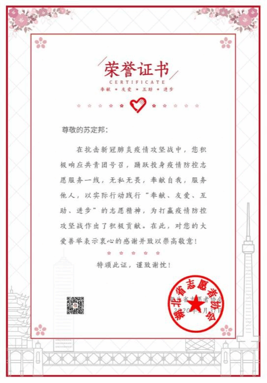 苏定邦积极践行“奉献、友爱、互助、进步“的志愿服务理念,踊跃参与各项志愿服务活动。在疫情期间积极响应号召,参加了学校组织的公益家教活动,辅导身在一线抗击新冠肺炎疫情医护人员的子女,得到了湖北省志愿者协会“抗击新冠肺炎疫情优秀志愿者”的荣誉,同时受到了学校学工处“先进个人”的表彰。他也参加了学校组织的“汉藏一家亲”公益辅导活动,辅导远在西藏的小朋友们,为促进汉藏友谊尽自己的一份微薄之力,受到了学工处“先进个人”的表彰。平日里其他的志愿活动他也积极参加,目前累计的义工时已超过50小时时长。他尽力帮助他人,让爱传递。